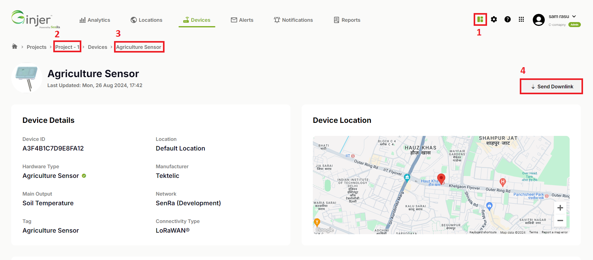 To send a downlink, click on the device, and a new tab will open. Navigate to the 'Send Downlink' option. Enter the PDU, timeout, and port number. Select 'Confirm Message' if necessary. Click the 'Send Downlink' button"